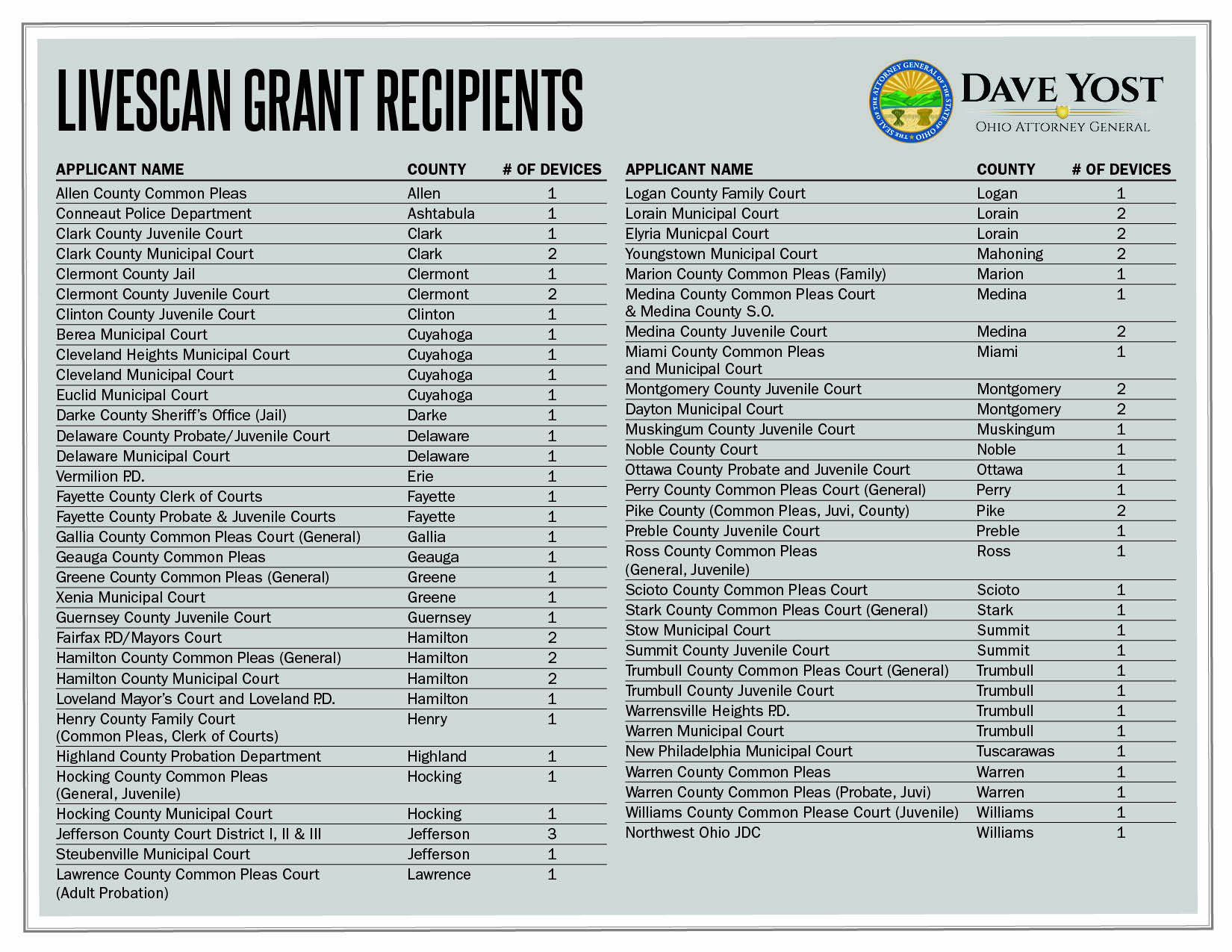 A grant program designed to enhance the accuracy and completeness of Ohio’s criminal-records repository will pay for 77 new devices that courts across the state will use to capture defendants’ fingerprints for submission to the database, Ohio Attorney General Dave Yost announced July 2.