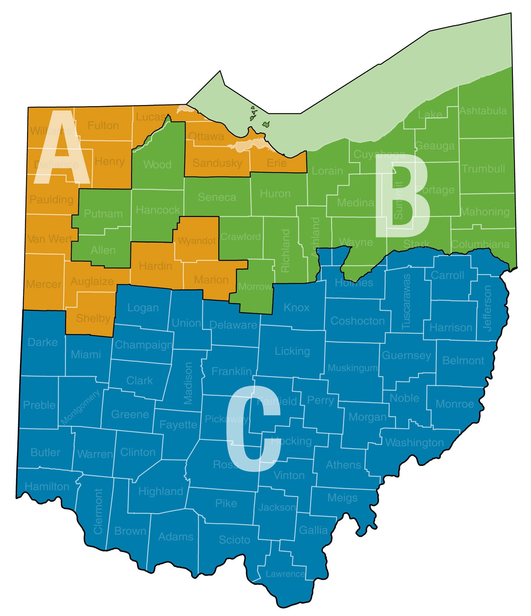 In the future zone map, Zone A falls in northwest Ohio, Zone B includes northeast Ohio and some areas in northwest Ohio, and Zone C covers southern counties and the remainder of the state. Hunters should note that, under the new rules, the waters of Lake Erie are part of Zone B, and the Zone A boundary extends 100 yards offshore into Lake Erie.